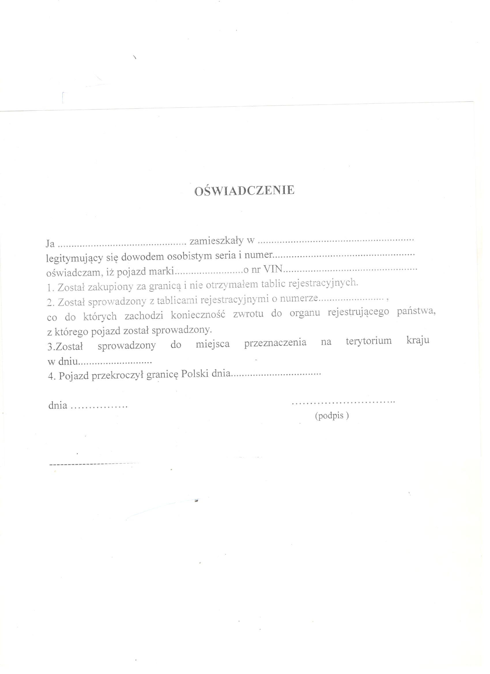 Oświadczenie w przypadku gdy pojazd został sprowadzony bez tablic rejestracyjnych lub w przypadku gdy zachodzi konieczność zwrotu tablic do organu rejestrującego państwa, z którego pojazd został sprowadzony.